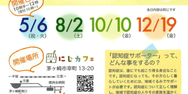 2025年10月10日(金)、12月19日(金)、茅ヶ崎市幸町・徳洲会病院そばのコミュニティカフェ「にじカフェ」にて「認知症サポーター養成講座」を開催します。 第一部「認知症サポーター養成講座」(事...
