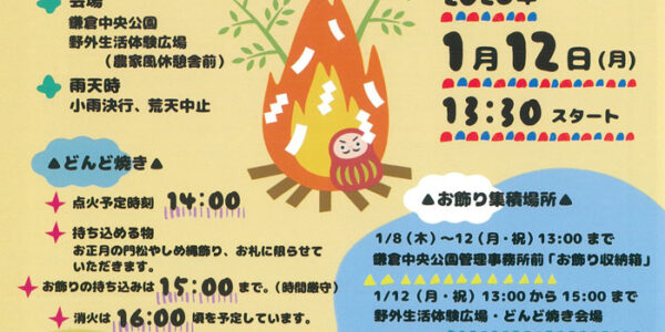 0 2026年1月12日(月・祝)、鎌倉中央公園にて「春の七草 どんど焼き」が開催されます。 山崎地区の伝統を継承して、「どんど焼き」を近隣自治会・町内会およびNPO法人山崎・谷戸の会との協働で開催します。 ◆どんど焼き … 続きを読む 【鎌倉】春の七草 どんど焼き