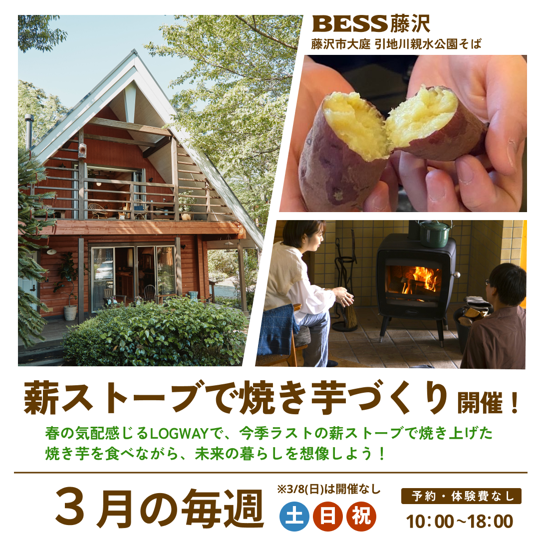 ログハウス・木の家展示場のBESS藤沢では、3月の週末(土・日・祝)で、今季ラストの薪ストーブで焼き上げたほくほくの焼き芋をご来場の皆さまにお配りいたします!