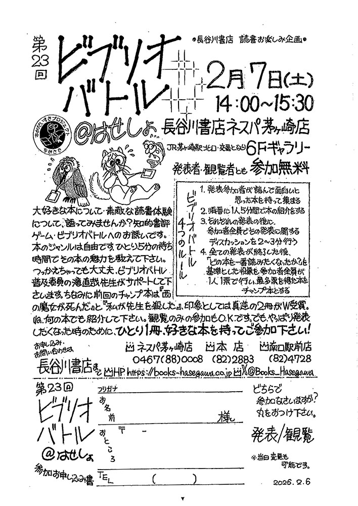 2026年2月7日(土)、長谷川書店 ネスパ茅ヶ崎店にて「ビブリオバトル」を開催します!