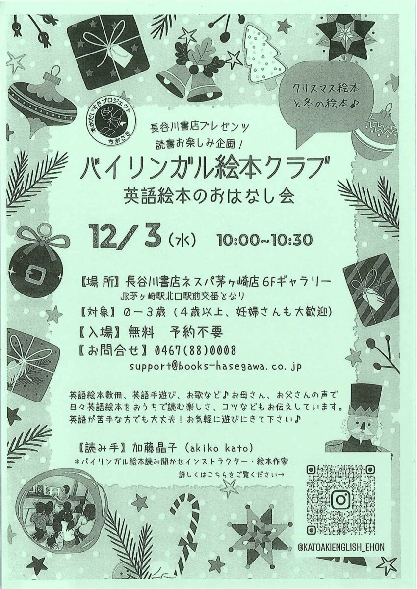 2025年12月3日(水)、長谷川書店 ネスパ茅ヶ崎店にて「バイリンガル絵本クラブ ~英語絵本のおはなし会~」を開催します!
