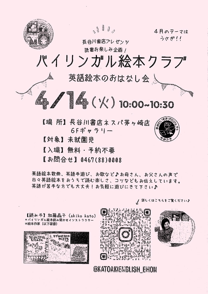2026年4月14日(火)、長谷川書店 ネスパ茅ヶ崎店にて「バイリンガル絵本クラブ ~英語絵本のおはなし会~」を開催します!
