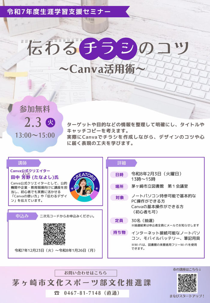 | ウェブサイトURL | https://www.city.chigasaki.kanagawa.jp/bunka_shogai/koza/1065800.html |
