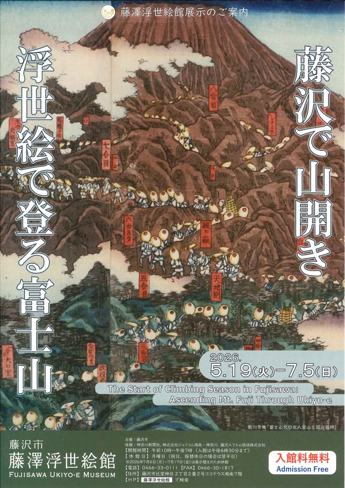 本展では、江戸時代末期に大ブームとなった富士講の歴史とともに、歌川広重や歌川貞秀などの絵師たちが描いた多様な富士山を紹介します。浮世絵を通して、藤沢で一足早い富士山の山開きをお楽しみください。