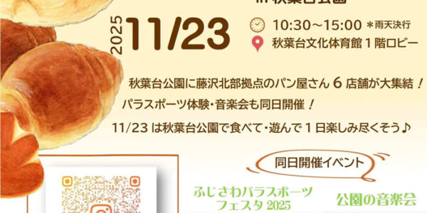 0 2025年11月23日(日・祝)、秋葉台文化体育館にて「ふじさわ北部★パン祭り in 秋葉台公園」が開催されます。同日、「ふじさわパラスポーツフェスタ2025」「公園の音楽会」も行われます。 秋葉台公園に、藤沢市の北 … 続きを読む ※今年度は終了しました※【藤沢】ふじさわ北部★パン祭り in 秋葉台公園