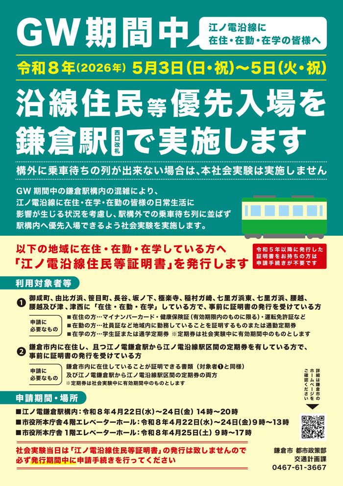 ゴールデンウィーク(GW)期間中の鎌倉駅構内の混雑により、江ノ電沿線に在住・在学・在勤の方の日常生活に影響が生じる状況を考慮し、駅構外での乗車待ちの列に並ばずに駅構内に優先入場できるように社会実験を行います。