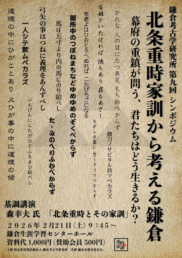 鎌倉幕府草創期の英雄、北条義時の子息である北条重時は、鎌倉に極楽寺を開いたことで知られます。父・義時らが執権として鎌倉の政務にあたっていたころ、重時は京都で六波羅探題を務め、公家社会でも一目置かれていた重要人物です。その重時が、武家社会での振る舞いやマナーを記したものが「北条重時家訓」です。この家訓から鎌倉武士がどのような心構えで鎌倉時代を生き抜いたか、武士同士はどのような交流をしたか、講演や研究発表で追求します。