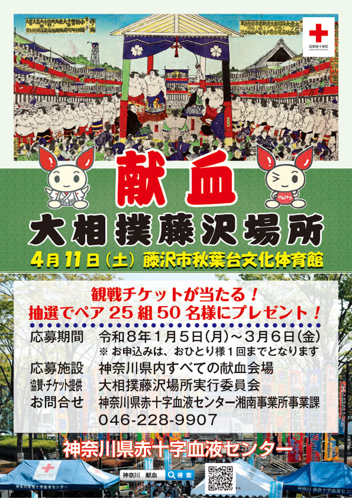 ②大相撲藤沢場所当日は、当選された方の写真撮影やインタビューなどをさせていただく場合がございます。また後日、献血推進のための広報素材として使用する予定です。 撮影及び当センターが行う広報への活用にご理解とご協力をくださるようお願いいたします。