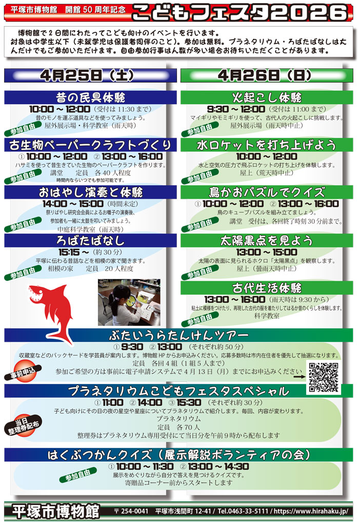 平塚市博物館で2日間にわたって子ども向けのイベントを行います。