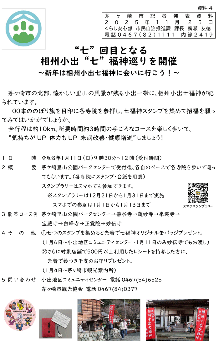 お正月に巡ると「七つの災難から逃れ、七つの福徳を授かる」と言われる七福神巡り。相州小出七福神巡りは今回は“七”回目の開催です。