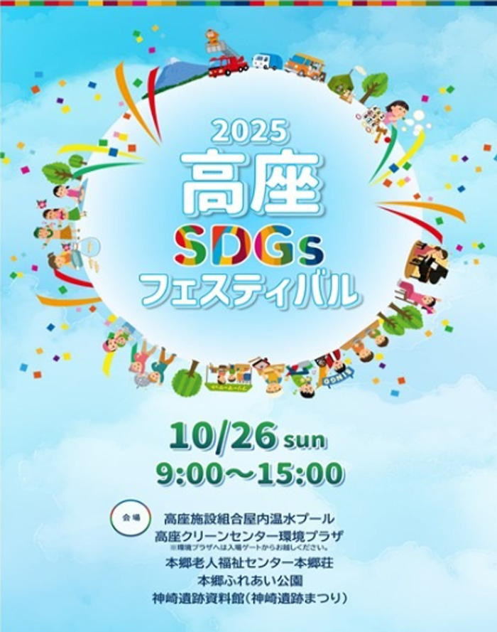 高座施設組合屋内温水プール、高座クリーンセンター環境プラザ、本郷老人福祉センター本郷荘、本郷ふれあい公園、神崎遺跡資料館(神崎遺跡まつり)を舞台に行われる秋のおまつり! ゴミ収集車の展示や環境プラザのバックヤードツアー、フリーマーケットなど、環境を意識するSDGsなことから、演奏会や、公園や温水プールでの遊び、歴史を体験できるコーナーなど、様々な催しが目白押し。もちろん、キッチンカーが出店してお腹も満足!