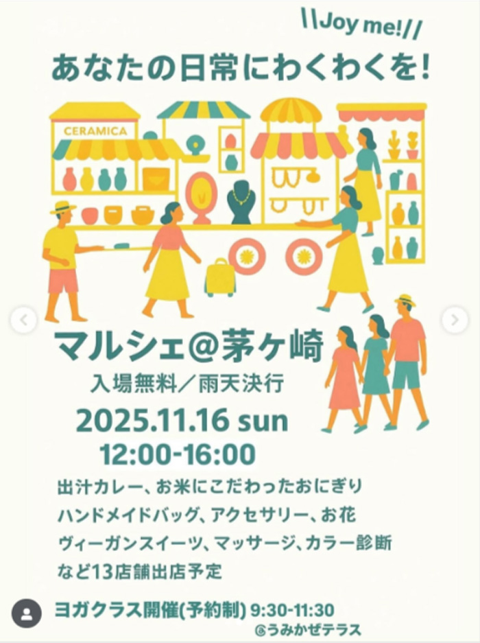 出汁カレー、お米にこだわったおにぎり、ハンドメイドバッグ、アクセサリー、お花、ヴィーガンスイーツ、マッサージ、カラー診断など13店舗が出店予定です。