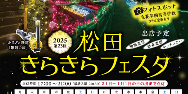 0 2025年11月29日(土)、30日(日)、12月6日(土)、7日(日)、13日(土)、14日(日)、16日(火)~12月31日(水)、2026年1月1日(木)の日の出まで、松田町西平畑公園にて「第23回 松田きらき … 続きを読む 【松田】第23回 松田きらきらフェスタ