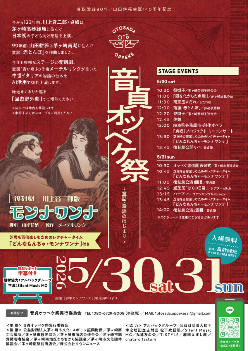 123年前の台本をもとにした復刻劇「川上音二郎版 モンナワンナ」を始め、ステージイベント、呈茶席、俳句、書道展、緑地内ガイド、飲食ブースなど多数。ステージイベントと復刻劇には、観劇サポート字幕付き。芝居を百倍楽しむためのレクチャータイムも設けます。