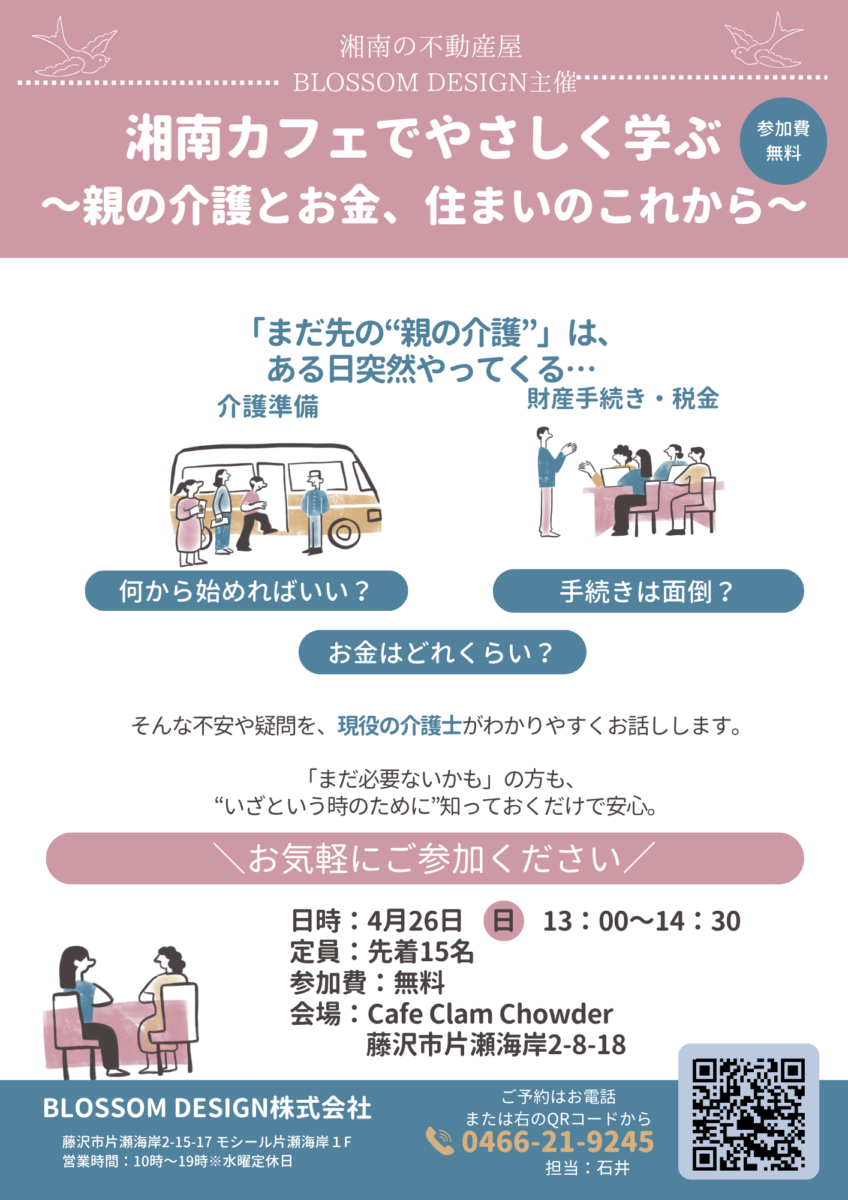 将来、親の介護に直面する可能性のある方に向けて、現役の介護士の方が介護の現場のリアルなお話や何を準備しておくとよいか等を具体的にお話してくれます。湘南での介護歴が豊富な現役介護士さんがお話をしてくれます。湘南のおしゃれなカフェでお茶を飲みながら(ワンドリンク制)、リラックスして聞いていただきたいと思います。介護に伴う家にまつわるアドバイスや税金などのお話も識者から聞くことができます。