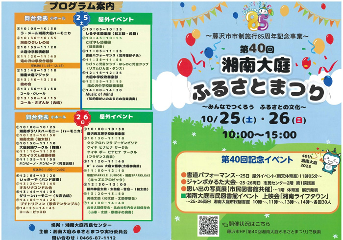 今年は湘南ライフタウンの開発から50年が経過し、湘南大庭市民センターも開設から40周年を迎えます。そして「湘南大庭ふるさとまつり」も40周年!40年の歩みを感じながら、心温まる交流の場となるこのお祭りに、ぜひご家族やお友達とご一緒にご参加ください。