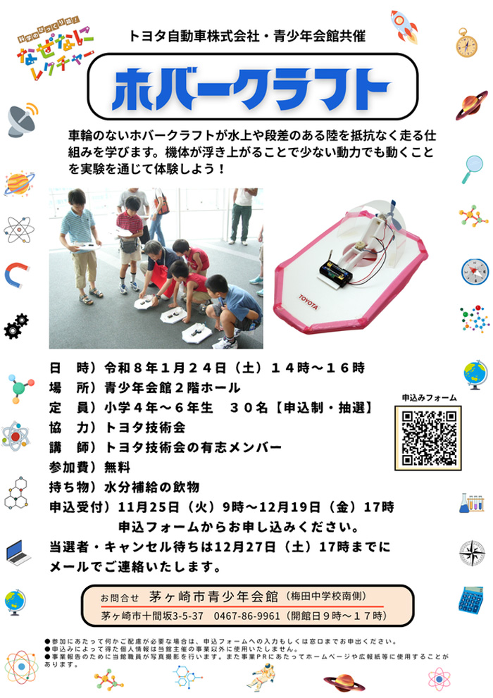 茅ヶ崎市青少年会館では、トヨタ自動車株式会社と共催で、小学校高学年を対象とした「科学のびっくり箱!なぜなにレクチャー」を開催します。