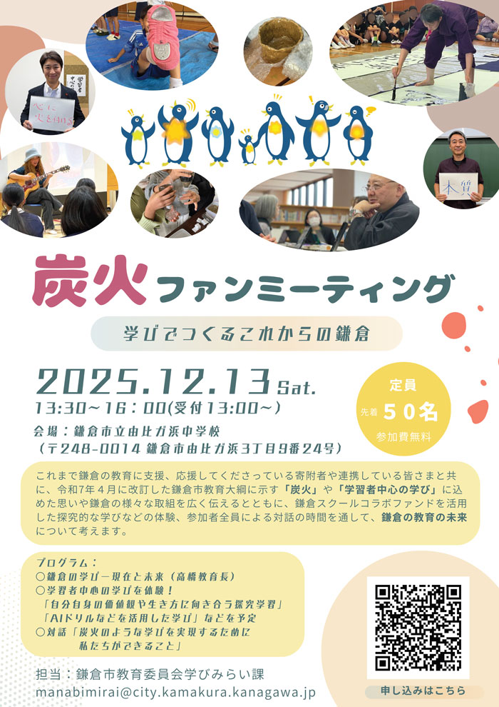 令和7年4月に改訂した鎌倉市教育大綱に示す「炭火」や「学習者中心の学び」に込めた思いやかあmクラの様々な取り組みを広く伝えるとともに、鎌倉スクールコラボファンドを活用した探求的な学びなどの体験、参加者全員による対話の時間を通して、鎌倉の教育の未来について考えます。