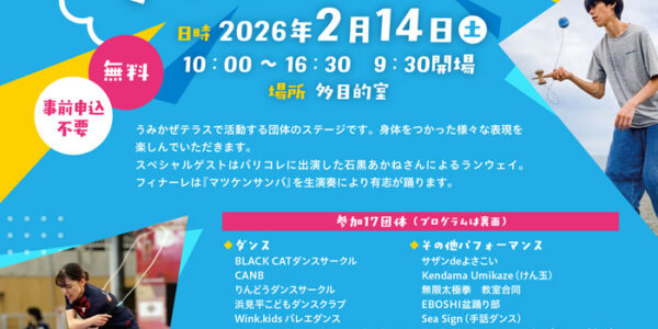 1+ 2026年2月14日(土)、茅ヶ崎公園体験学習センターうみかぜテラスにて「うみかぜテラスパフォーマンス」が開催されます。とことこ暮らしやとことこマルシェでおなじみの「YukaYogaWheel」のYukaさんが主宰 … 続きを読む ※本年度は終了しました※【茅ヶ崎】うみかぜテラスパフォーマンス