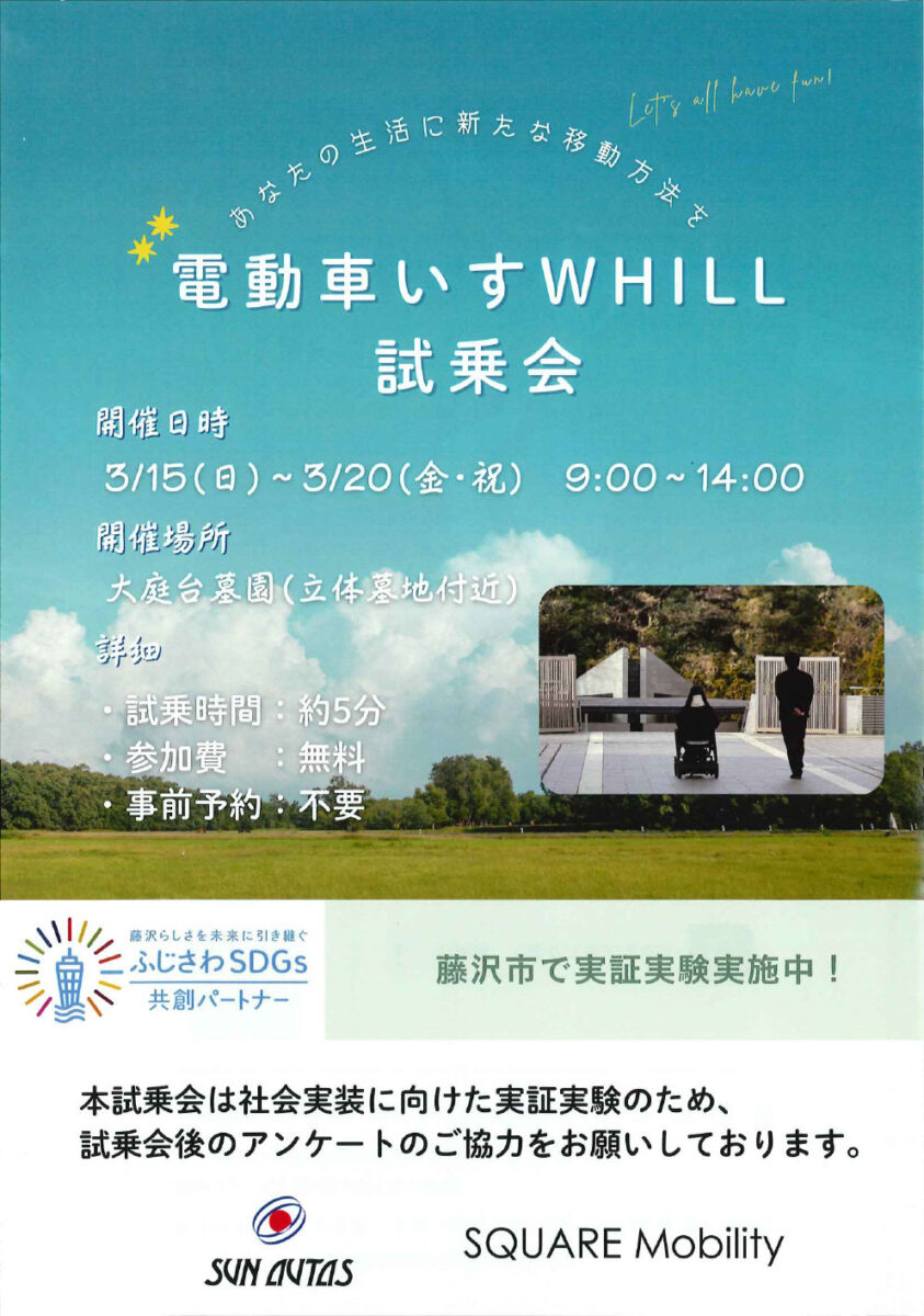 2026/3/15(日)~3/20(金・祝) 、大庭台墓園にて「電動車いすWHILL 試乗会」が実施されます。