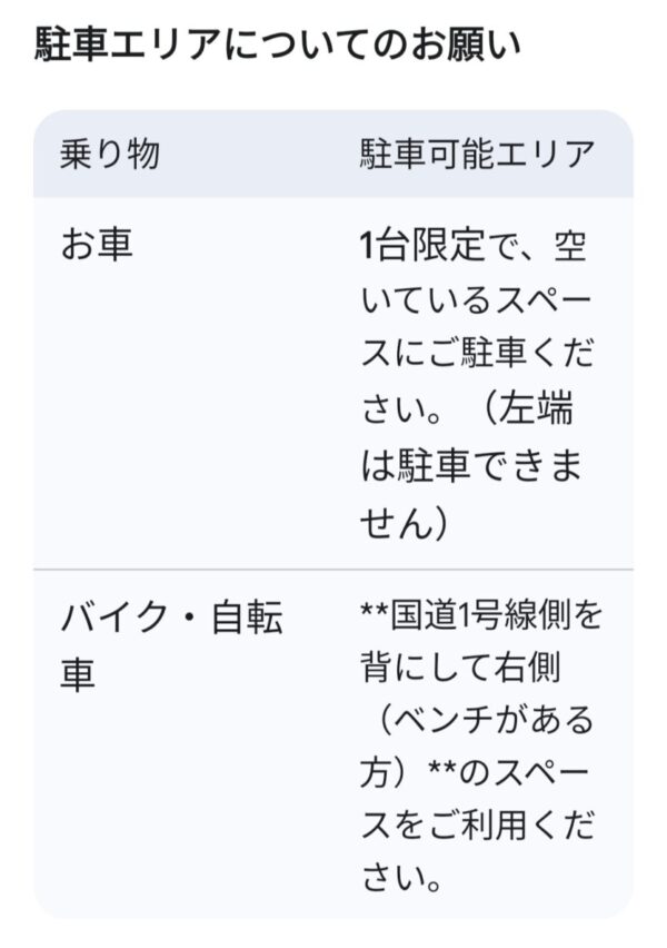 お車での駐車は、大変申し訳ありませんが【1台限定】でお願いします。