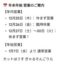 19日(金)通常通り、店先の予約で営業です。年末年始営業案内あり。