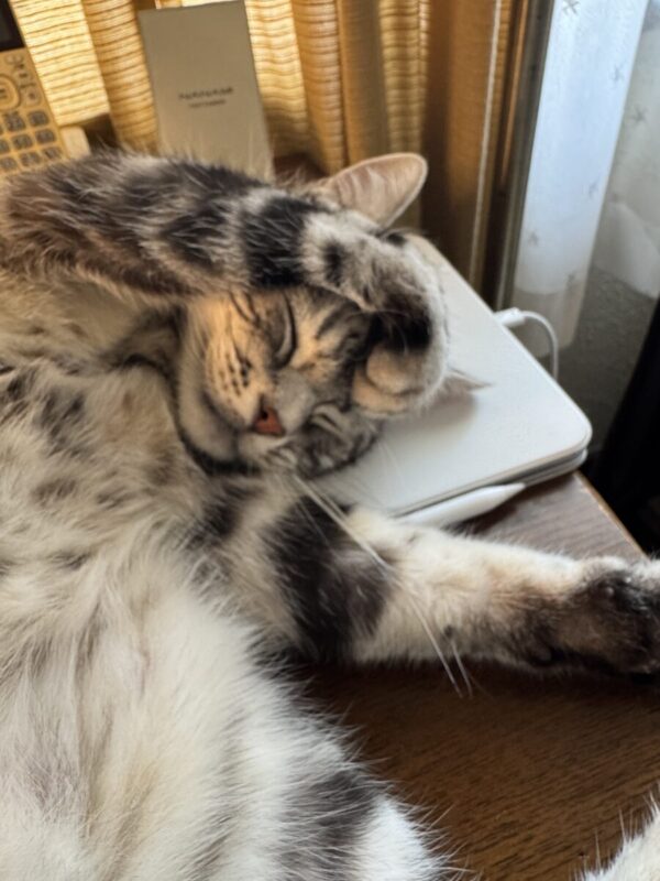 私がブログを書いている横でこんなに寝相悪く、お昼寝しております。