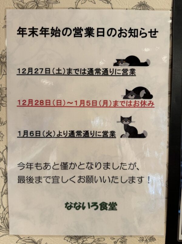 年末年始の営業日のお知らせ(ラーメン屋 なないろ食堂)