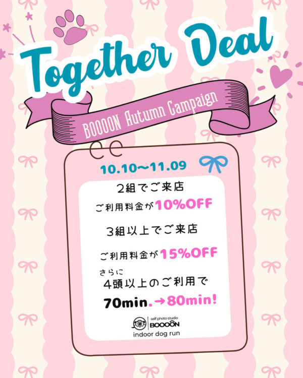 さらにわんちゃん4頭以上でご利用の場合には初回70分が80分に拡大!