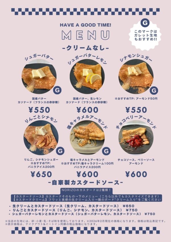 | 備考 | 現金、QRコード決済対応 お問い合わせはInstagramからお待ちしております クレープとガレットNORIZO公式Instagramはこちら |