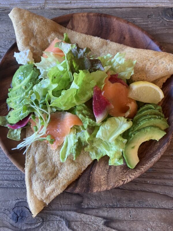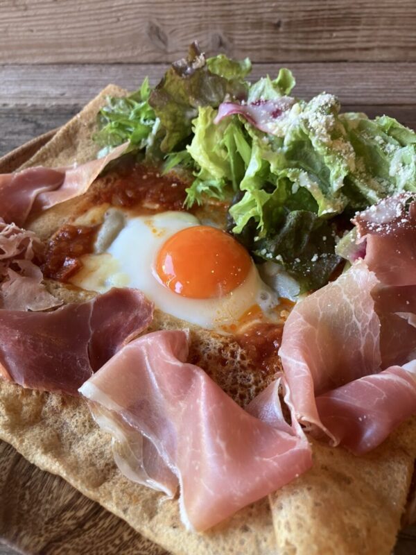 本場フランス・ブルターニュ地方出身のシェフが行う研修を受け、そば粉の香りを楽しんで頂ける生地作り、焼き方にこだわりました。ハムやチーズ、卵、お野菜との相性抜群ですが、甘い系にもマッチします。