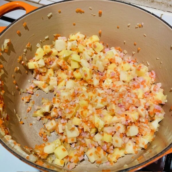 人参、ベーコンを加え、最後にじゃがいもを入れ炒める。